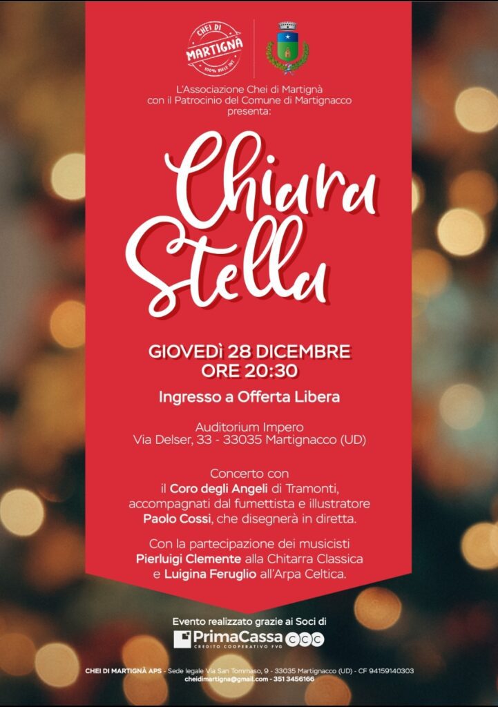 Martignacco si prepara a vivere una serata all'insegna dell'arte e della musica con il concerto "Chiara Stella", organizzato dall'associazione Chei di Martignà in collaborazione con il Comune. L'appuntamento è fissato per giovedì 28 dicembre alle ore 20.30, presso l'Auditorium Impero.