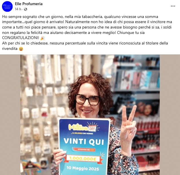 “Ho sempre sognato che un giorno nella mia tabaccheria qualcuno vincesse una somma importante. Quel giorno è arrivato. Naturalmente non ho idea di chi possa essere il vincitore, ma come a tutti noi piace pensare, spero che sia una persona che ne avesse bisogno, perché si sa, i soldi non regalano la felicità ma aiutano a vivere decisamente meglio. Chiunque tu sia, congratulazioni!”