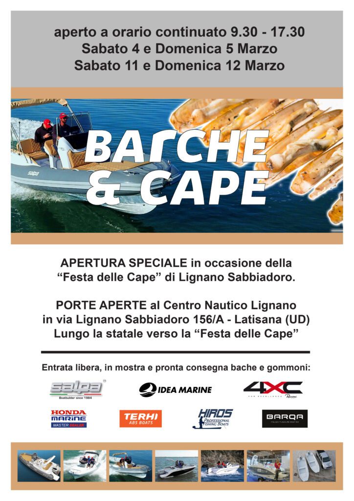 Centro Nautico Lignano apre eccezionalmente entrambi i week end 4 e 5 Marzo e poi 11 e 12 Marzo, con orario continuato 9.30 fino alle 17.30 per mostrare tutte le barche e gommoni nuovi e usati, pronti per la stagione estiva 2023.