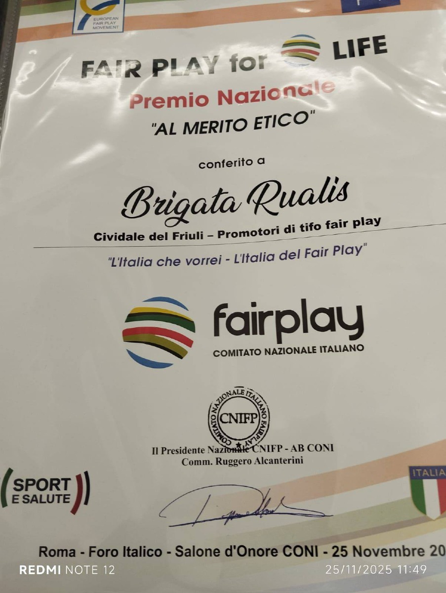 CIVIDALE DEL FRIULI – Una giornata destinata a rimanere nella memoria del tifo gialloblù. La Brigata Rualis, anima pulsante del pubblico del PalaGesteco, ha ricevuto a Roma un riconoscimento mai assegnato prima a una tifoseria: il prestigioso Premio Nazionale “Fair Play for Life”, consegnato dal Coni nel Salone d’Onore del Foro Italico. Un traguardo che supera il semplice gesto sportivo e diventa il simbolo di un modo di vivere la passione che unisce, crea comunità e valorizza i comportamenti corretti.