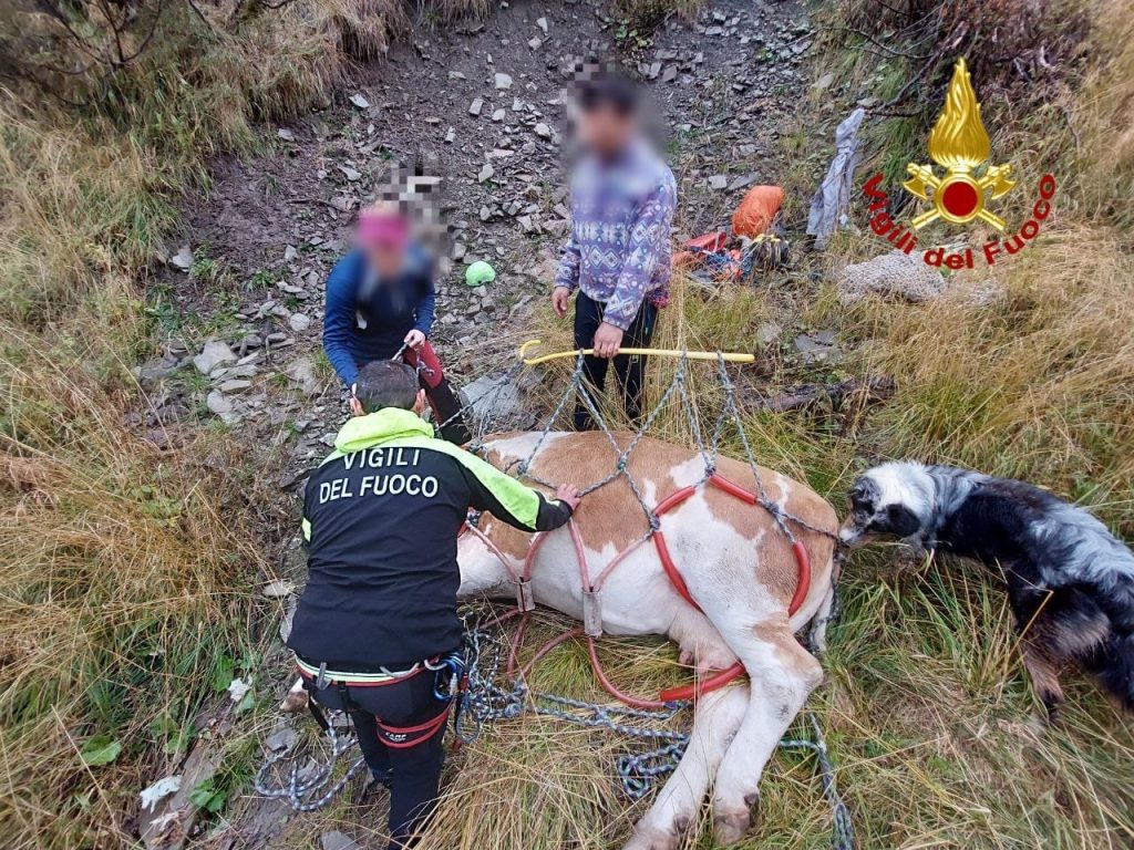 La mucca era caduta in un canale reso molto scivoloso dalla pioggia e stava continuando a scivolare verso il basso.