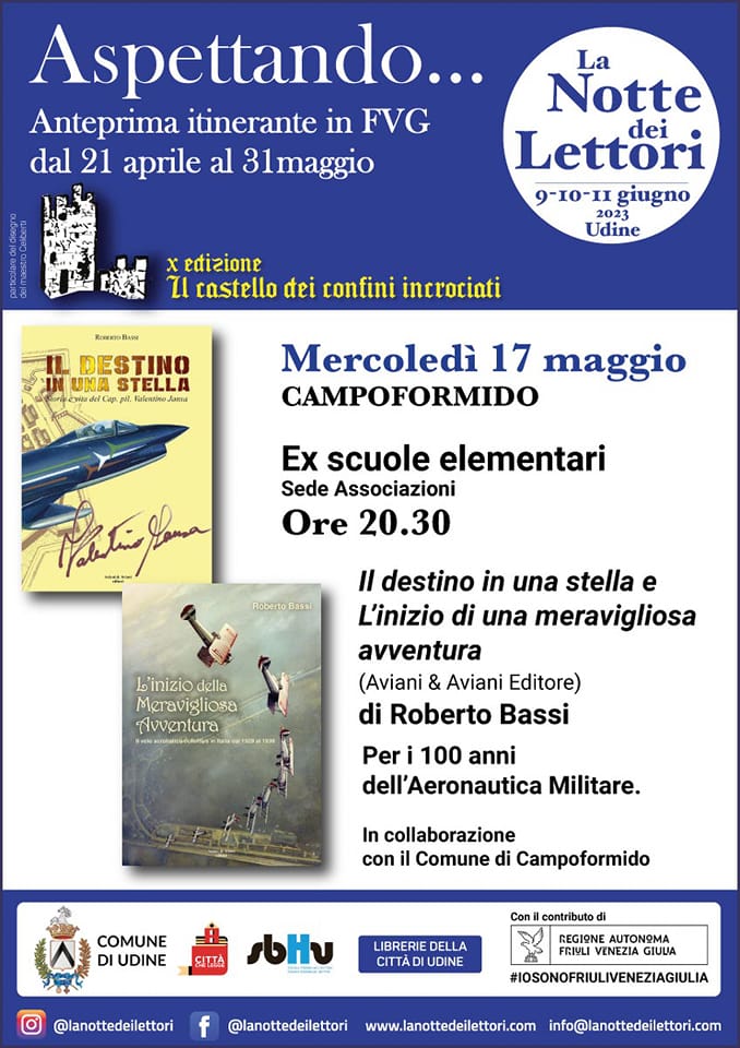 Si inizia con mercoledì 17 maggio 2023 alle ore 20.30, presso la sede delle associazioni in via de Amicis 2 a Campoformido, con l'Incontro con l'autore Roberto Bassi per i 100 anni dell'Aeronautica Militare nell'ambito delle serate Aspettando la Notte dei Lettori, in collaborazione con Associazione Pro Loco di Campoformido Aps e Associazione Arma Aeronautica Sezione di Campoformido.