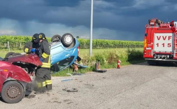 Due auto si scontrano, una si ribalta: conducente incastrato nel veicolo