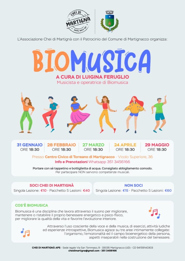 MARTIGNACCO. Dopo un breve periodo di pausa, tornano gli eventi organizzati dall'associazione Chei di Martignà. La prima proposta è un ciclo di cinque incontri di biomusica, che si terranno presso il Centro Civico di Torreano di Martignacco a partire da martedì 31 gennaio dalle ore 18.30.
