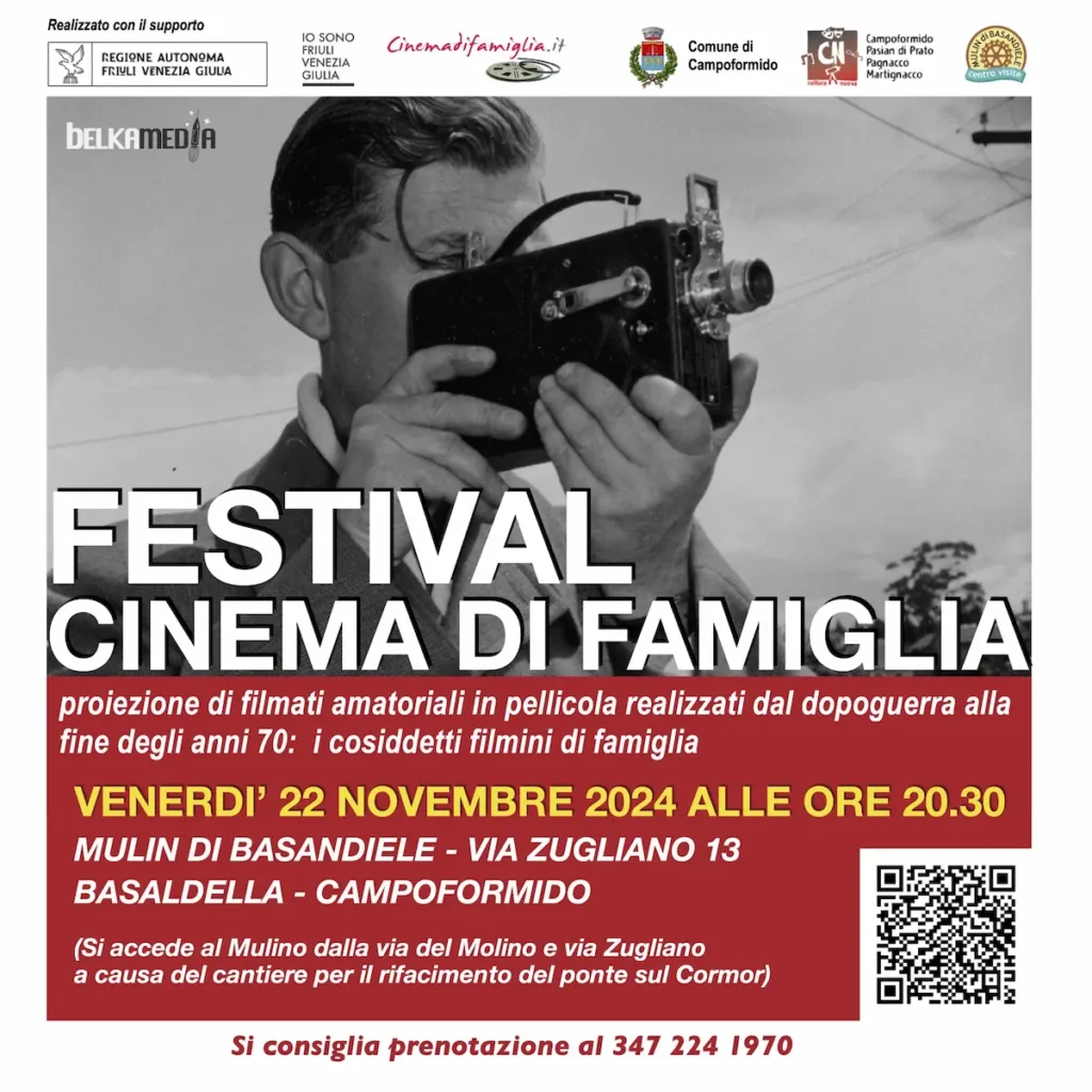CAMPOFORMIDO - Il festival "Cinema di Famiglia" prosegue la sua edizione 2024 con un evento speciale a Campoformido, in provincia di Udine. Il festival, organizzato dalla cooperativa Belka Media con il contributo della Regione Autonoma Friuli Venezia Giulia, si è affermato come un’importante occasione per riscoprire il passato attraverso immagini che raccontano la vita quotidiana delle persone e delle comunità di un tempo. La serata di venerdì 22 novembre avrà luogo presso il Mulin di Basandiele, situato in via Zugliano 13, a partire dalle ore 20.30.
