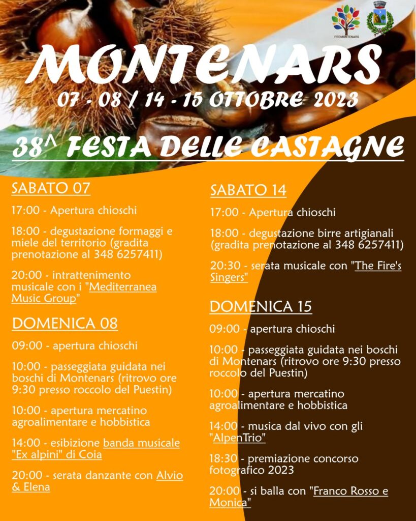 La 38ª Festa delle Castagne si svolgerà a Montenars il 14 e 15 ottobre 2023, con un programma che include l'apertura di chioschi e degustazioni di birre artigianali il 14 ottobre. I chioschi saranno aperti nelle giornate di sabato dalle 17:00 e le domeniche dalle 9:30. Domenica 8 e 15 ottobre si terrà la prima edizione della mostra-mercato della festa delle Castagne presso il campo di tennis adiacente alla Sagra.