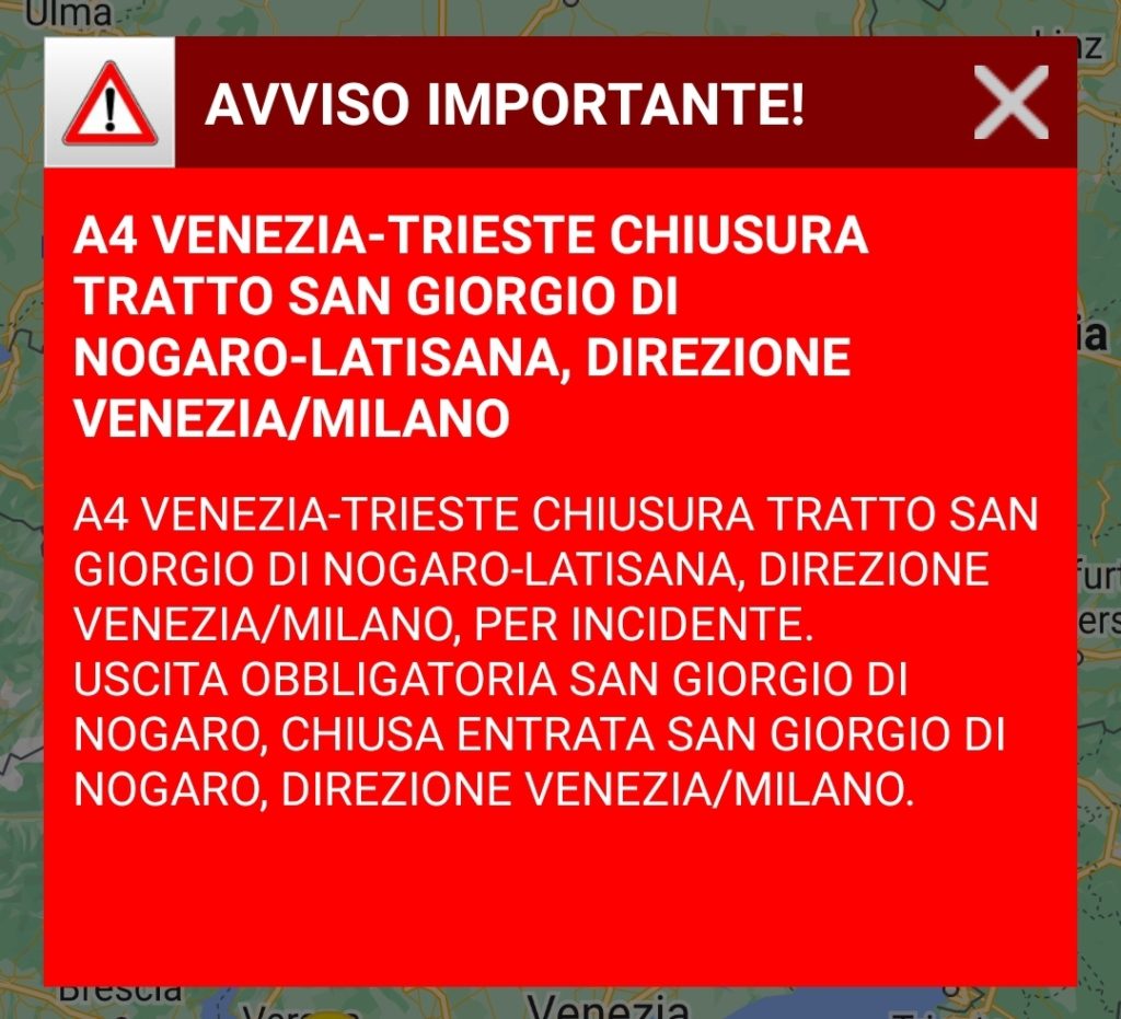 I veicoli provenienti da Trieste vengono fatti uscire a San Giorgio di Nogaro. Chiuso anche l’ingresso di San Giorgio in direzione Venezia.