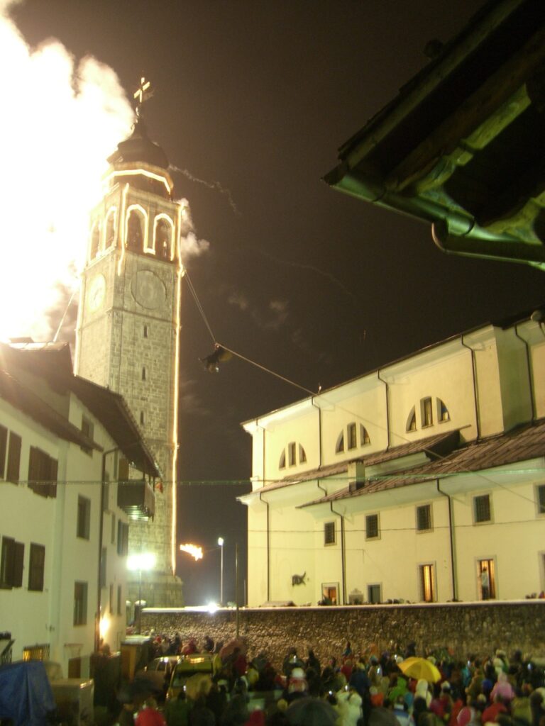 La discesa al buio dai 46 metri di altezza del campanile di Forni di Sopra (il più alto della Carnia) viene interrotta a metà da uno spettacolo pirotecnico e si conclude poi con l’atterraggio nel sagrato della Chiesa di Santa Maria Assunta e la distribuzione dei doni ai bambini.