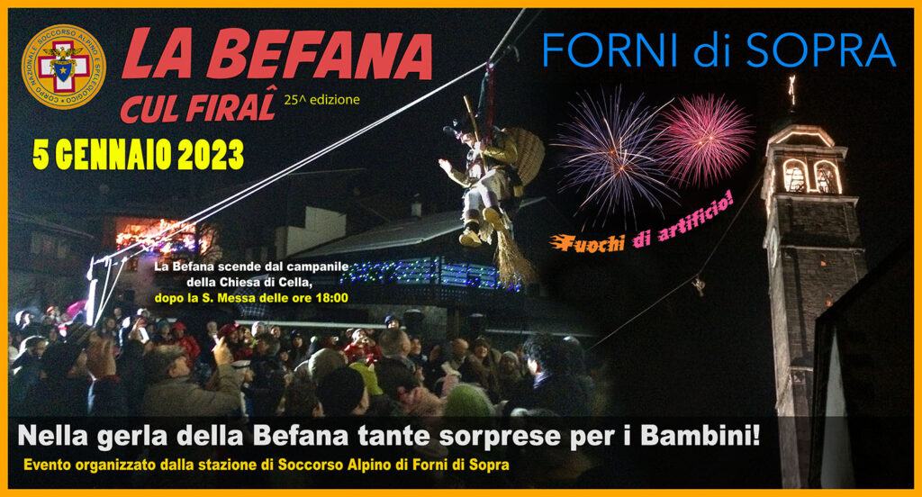 Giovedì 5 gennaio 2023 a Forni di Sopra si terrà la 25^ Edizione della discesa della "Befana cul Firâl” dal grande campanile della Chiesa Parrocchiale. La discesa è prevista per le ore 19:15, dopo la S. Messa.