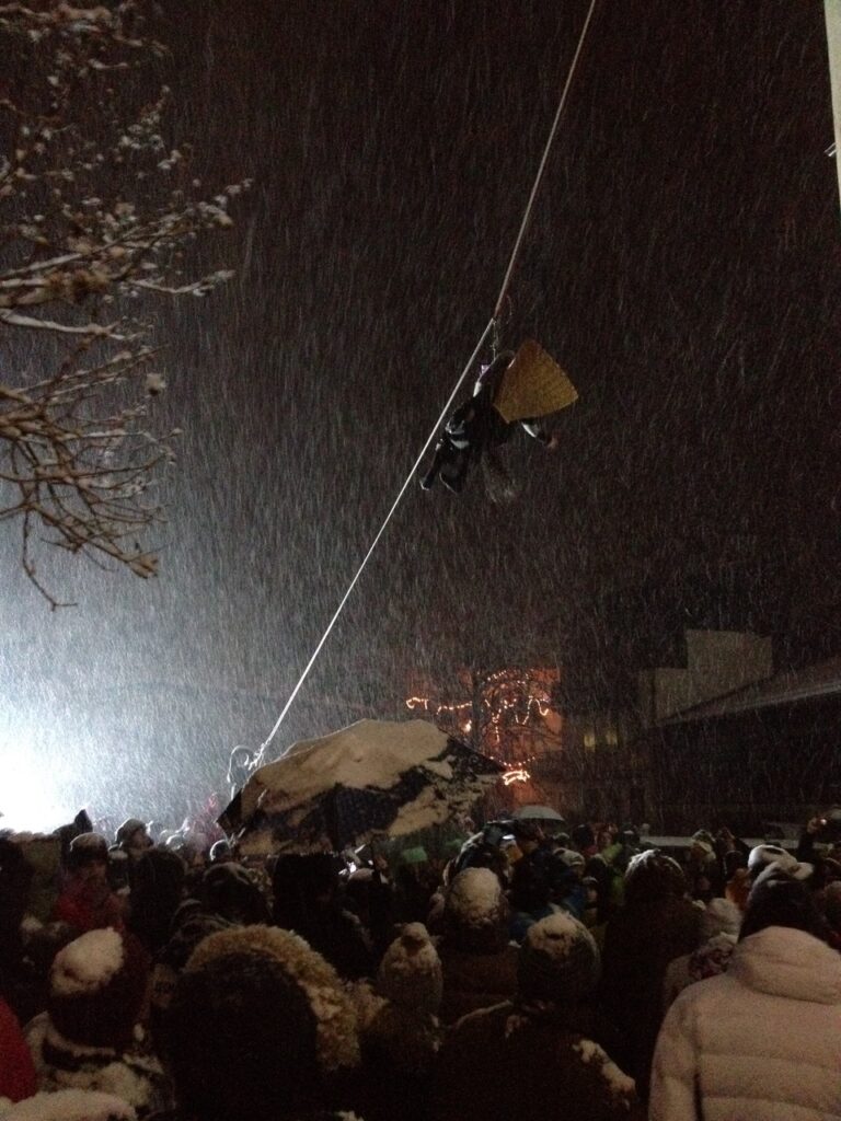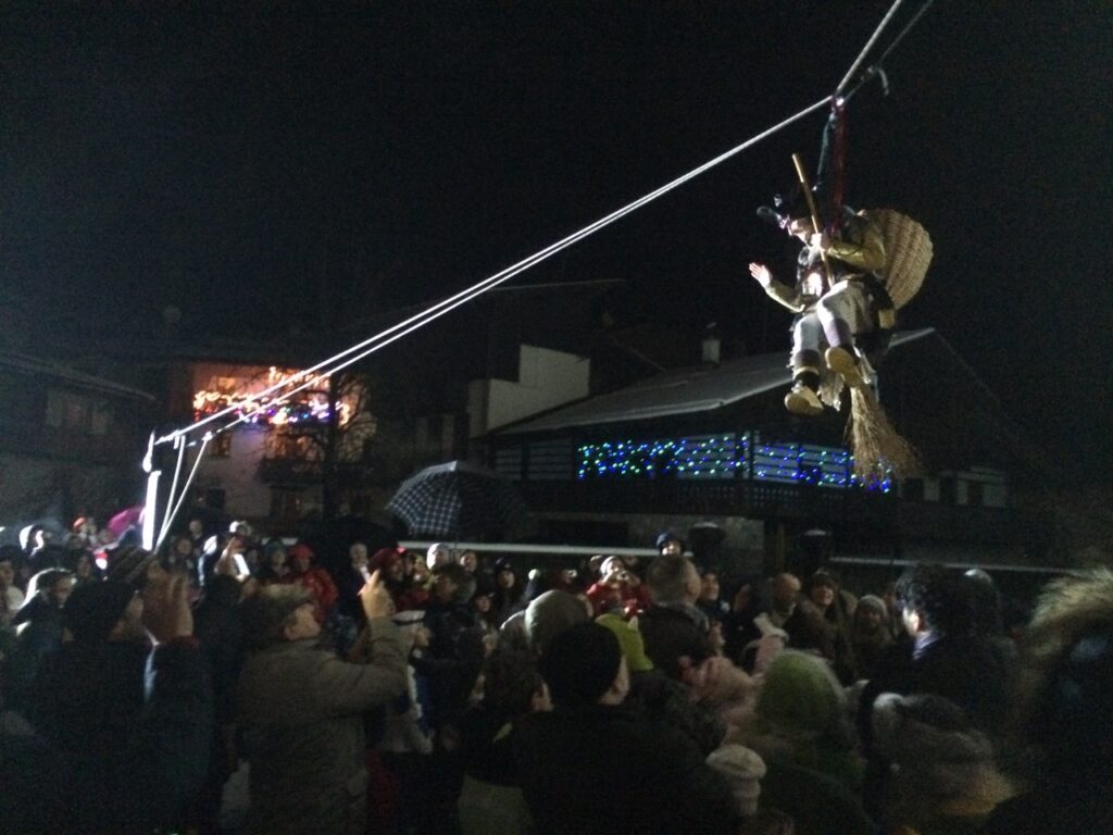 La suggestiva discesa della Befana, seduta a cavalcioni sulla scopa, avviene lungo una "teleferica in corde”, una manovra utilizzata dal Corpo Nazionale del Soccorso Alpino per attraversare forre e canyon. Due resistenti funi fanno da supporto al carico, mentre un’altra fune manovrata dai soccorritori, regolano il trasferimento dello stesso lungo il tragitto.
