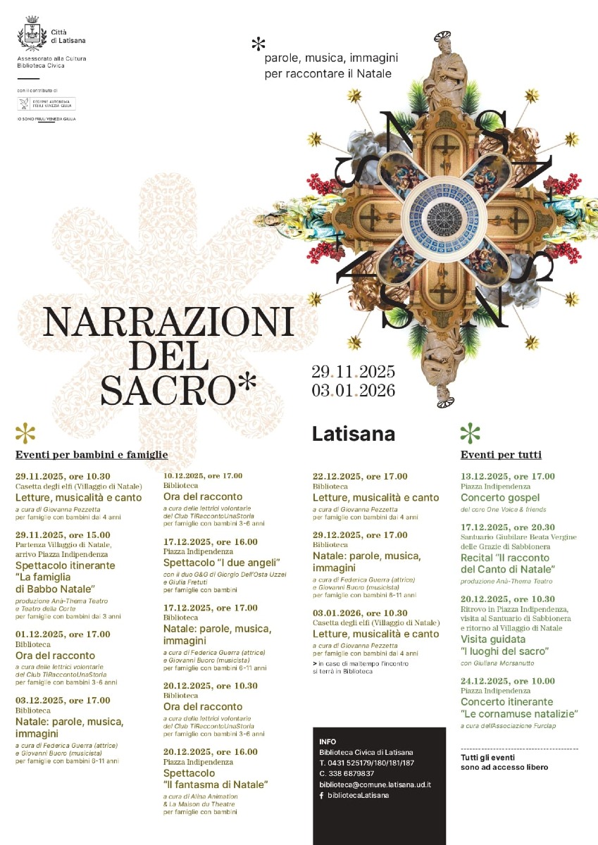 LATISANA (UD) – Con un programma ricco, diffuso e pensato per tutte le età, il Comune dà il via alla rassegna culturale “Narrazioni del Sacro: parole, musica, immagini per raccontare il Natale”, organizzata dall’Assessorato alla Cultura e dalla Biblioteca Civica, grazie al contributo della Regione Friuli Venezia Giulia. Un calendario articolato che unisce spettacoli all’aperto, letture, laboratori, concerti e percorsi tematici, trasformando la città in un grande palcoscenico dedicato alla magia e al significato più profondo delle festività natalizie.