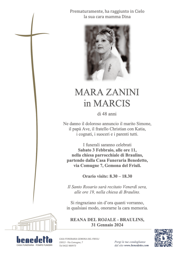 Il funerale di Mara Zanini si terrà sabato, alle 11, nella chiesa parrocchiale di Braulins. Il rosario sarà recitato domani, alle 19, nella stessa chiesa. Oltre al marito, Mara lascia il padre Avelino, il fratello Christian e numerosi altri parenti e amici.