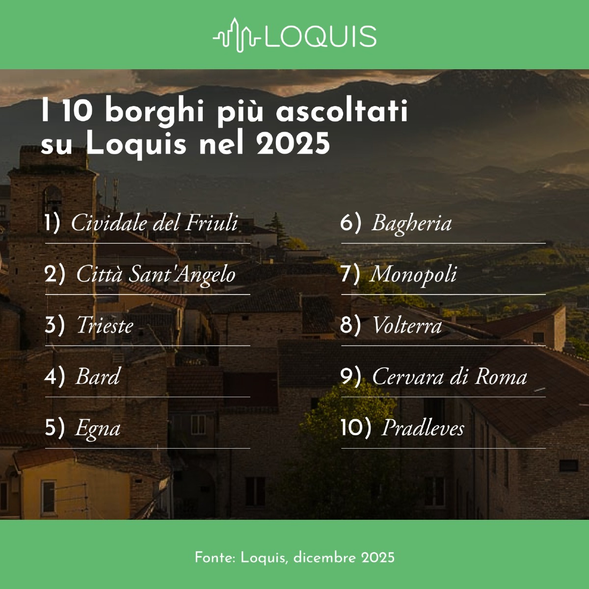 La classifica delle destinazioni più ascoltate su Loquis nel 2025 evidenzia una tendenza chiara. In vetta si colloca Cividale del Friuli, seguita da Città Sant’Angelo, due realtà che incarnano perfettamente il desiderio di scoprire luoghi ricchi di identità ma lontani dalle folle.