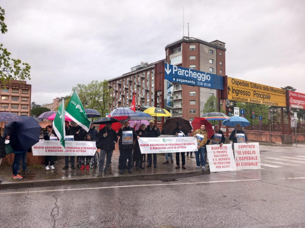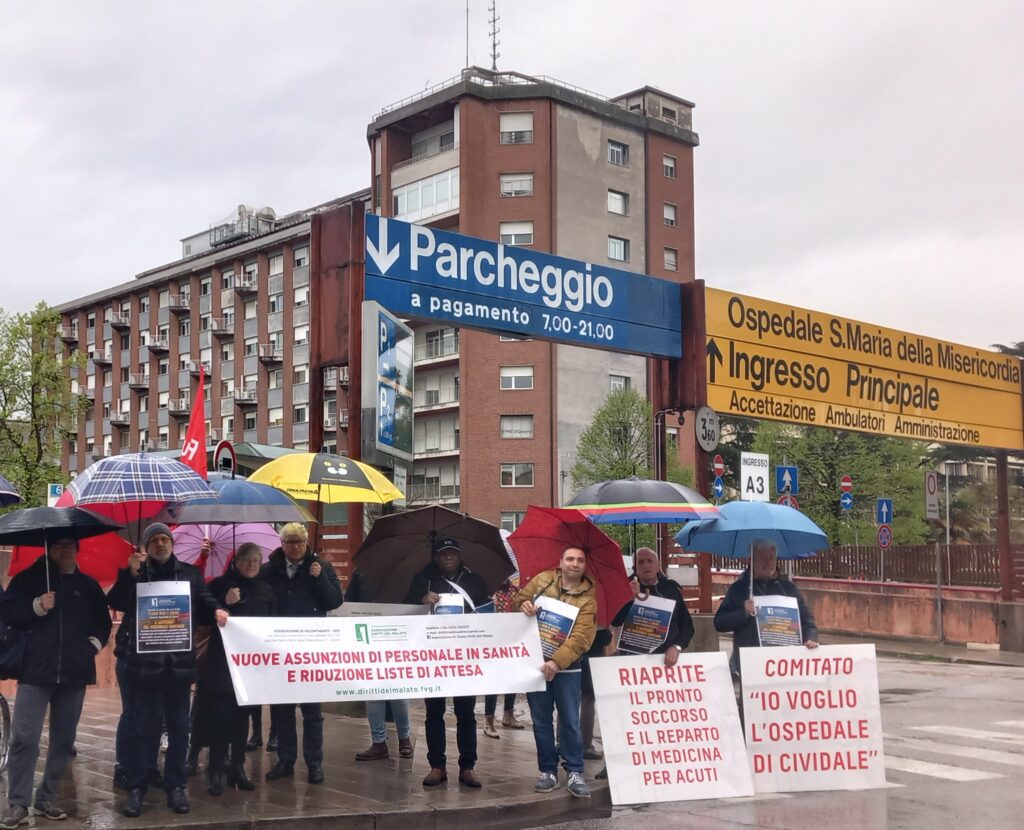 UDINE. Nonostante una pioggia battente circa 40 persone si sono radunate davanti all’Ospedale di Udine per richiedere di  allentare la pressione sul personale del Pronto Soccorso del nosocomio.  Il flash mob aperto a tutta la  Cittadinanza è stato organizzato oggi, 13 aprile 2023, dall’Associazione Diritti del Malato a sostegno del personale sanitario che opera quotidianamente  sotto fortissimo stress e dei Cittadini malati che  sono  costretti a sostare per ore sulle barelle del pronto soccorso  perché i reparti  sono saturi.