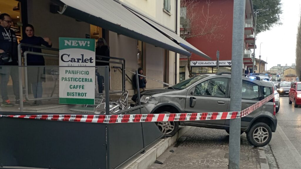 Paura a Udine, tampona un'auto e piomba sui tavolini della pasticceria: un ferito -
