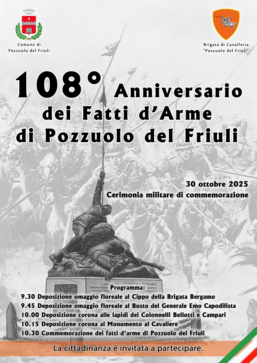 POZZUOLO DEL FRIULI (UD) – Due giornate di memoria e riconoscenza per ricordare l’eroismo della Battaglia del 1917, quando il paese friulano fu teatro di una resistenza decisiva dell’esercito italiano dopo la rotta di Caporetto. Le celebrazioni si svolgeranno in Piazza Julia con due eventi principali, dedicati alla storia e al valore dei cavalieri della Brigata “Pozzuolo del Friuli”.