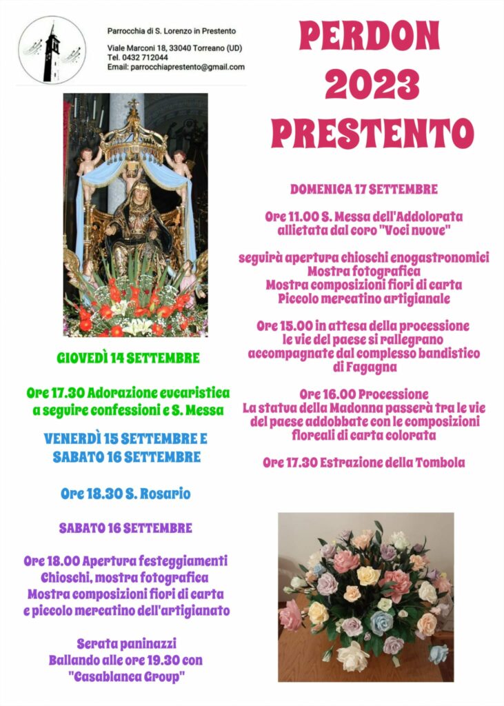 TORREANO (UDINE). Tutto ha origine nel 1895 successivamente a un episodio molto particolare: aggredito brutalmente da un paesano, il parroco di Prestento decise di perdonare quel gesto di violenza e, per dare un rilievo pubblico e simbolico al fatto, istituì la Festa del Perdon, stabilendo di celebrarla nella ricorrenza della Madonna Addolorata.