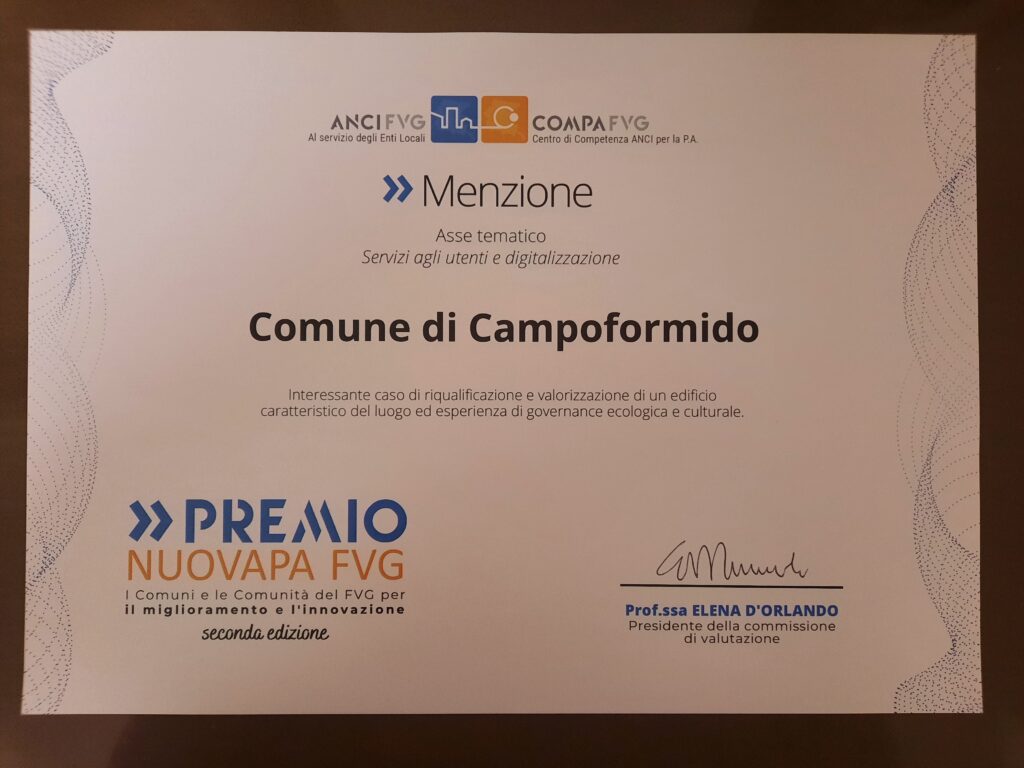 Il Sistema Integrato Anci-Compa FVG ha istituito nel 2022 il Premio NUOVAPA FVG al fine di dare pubblica visibilità e riconoscimento a quei Comuni e Unioni di Comuni del Friuli-Venezia Giulia che, a partire da azioni formative rivolte ai dipendenti e/o agli amministratori locali, si sono distinti per aver avviato un miglioramento e/o una innovazione del proprio Ente.