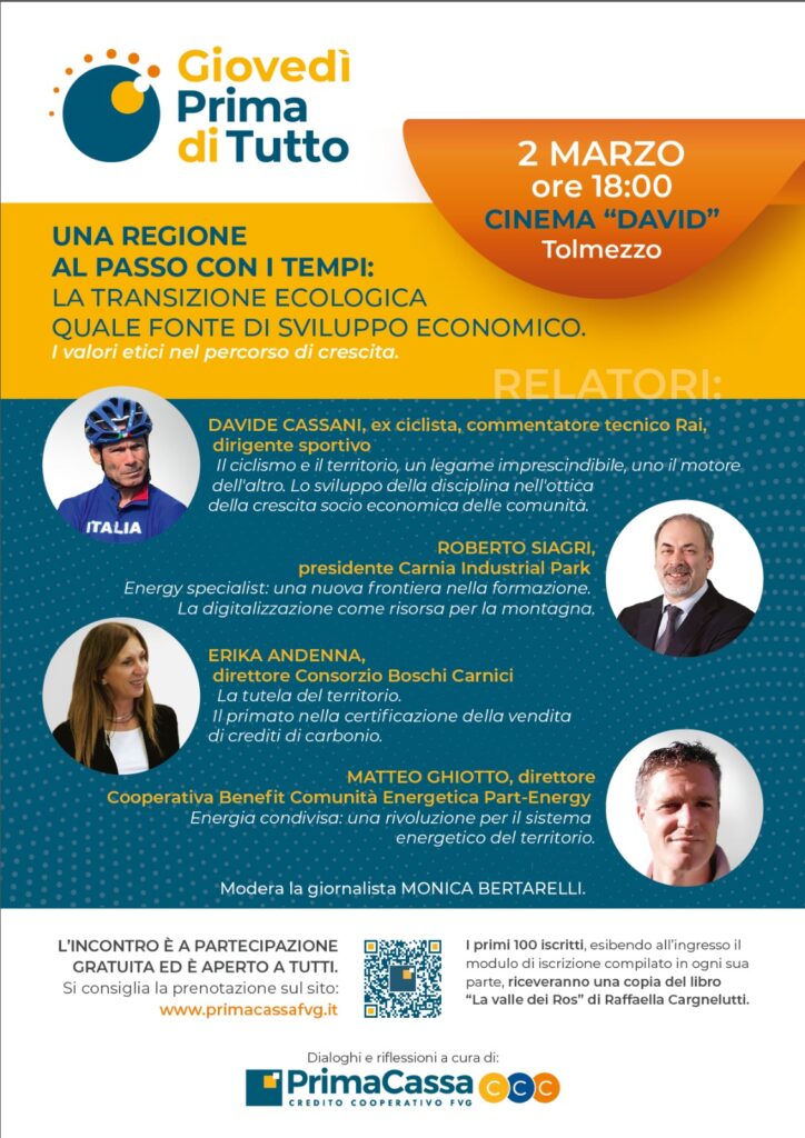 Ci saranno il famoso ciclista, ex ct della nazionale azzurra élite e dirigente sportivo Davide Cassani, lo scienziato e presidente di Carnia Industrial Park Roberto Siagri, Erika Andenna, Direttore del Consorzio Boschi Carnici e Matteo Ghiotto, direttore della Cooperativa Benefit Comunità energetica Part-energy.