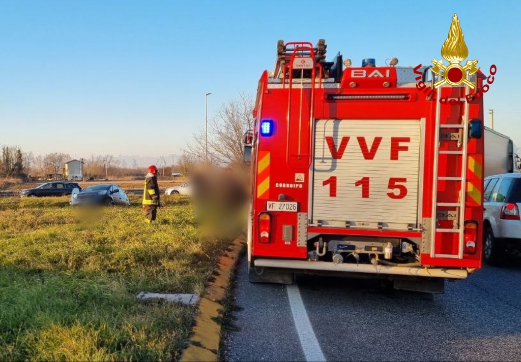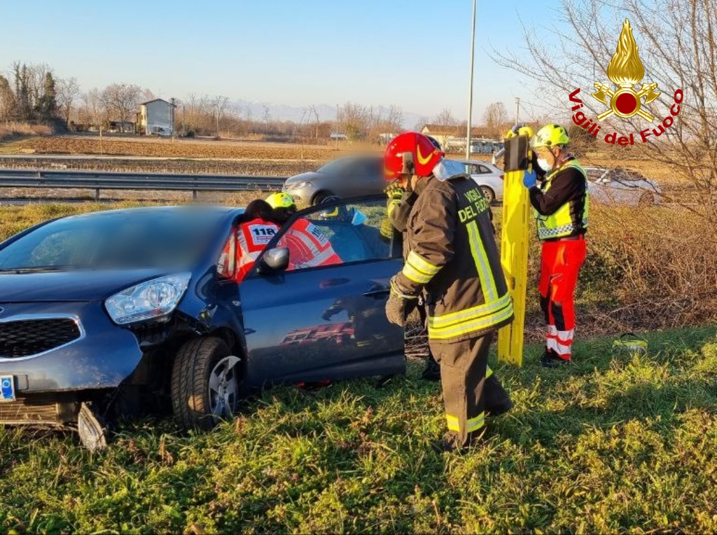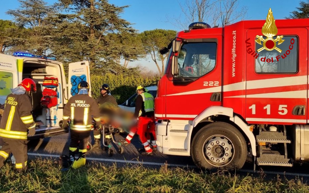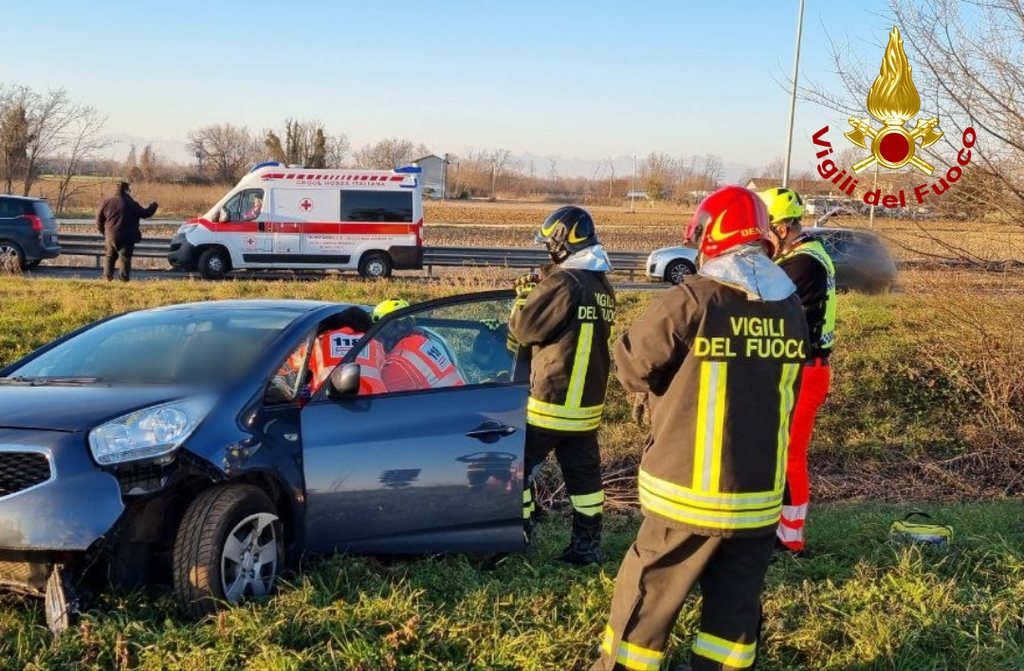 I Vigili del fuoco hanno collaborato con il personale sanitario, presente sul posto con due ambulanze, per soccorrere la guidatrice ferita di una delle due autovetture coinvolte nell'incidente che dopo l'impatto è uscita di strada finendo la sua corsa nel canale adiacente alla carreggiata.