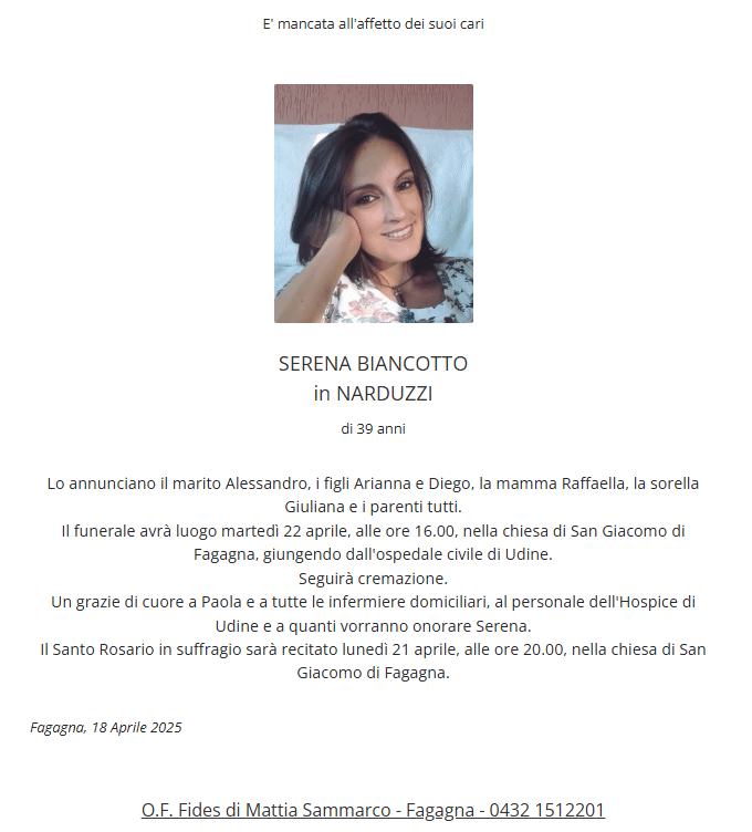 I funerali di Serena si terranno martedì 22 aprile, alle ore 16:00, nella chiesa di San Giacomo di Fagagna, con il corteo che partirà dall’ospedale civile di Udine. Dopo la cerimonia religiosa, seguirà la cremazione, secondo le sue volontà. La famiglia ha voluto esprimere un sentito ringraziamento a Paola e a tutte le infermiere domiciliari che l’hanno assistita, nonché al personale dell’Hospice di Udine per la dedizione e la cura nei suoi ultimi giorni di vita.