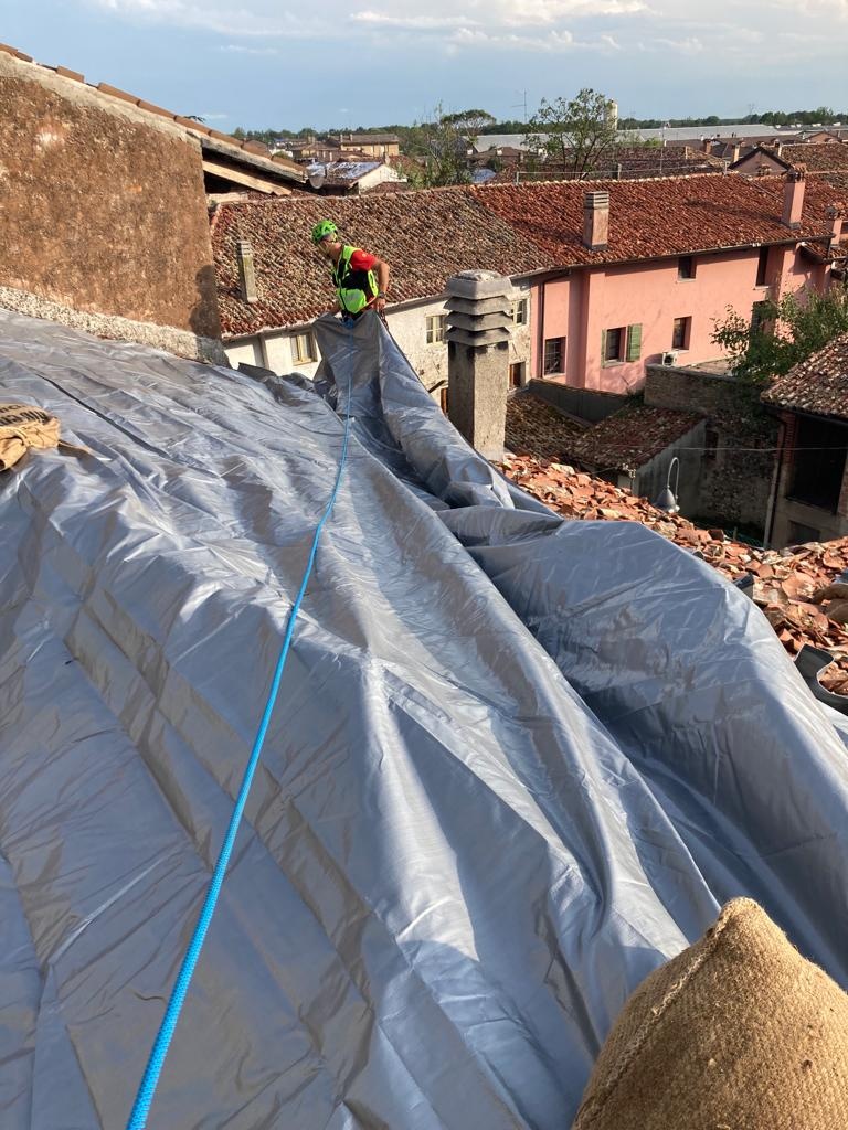 Tra le 17 e le 22 del 24 luglio e oggi per tutto il giorno fino a sera i soccorritori lavoreranno in sicurezza per apporre dei teli di protezione impermeabili sui tetti scoperchiati o seriamente danneggiati dalla tempesta.