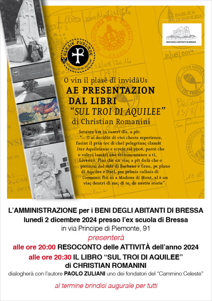 BRESSA DI CAMPOFORMIDO - Il 2 dicembre 2024, Bressa, frazione di Campoformido, accoglierà un importante evento in occasione del decimo anniversario del pellegrinaggio di Christian Romanini lungo il Cammino Celeste. L'autore presenterà il suo libro dal titolo “Sul troi di Aquilee”, che raccoglie il diario del suo cammino compiuto nell'agosto del 2014. Una serata speciale che non solo celebra questo importante traguardo, ma rappresenta anche un'opportunità per riflettere sul legame profondo tra la storia, la cultura e l'identità del Friuli.