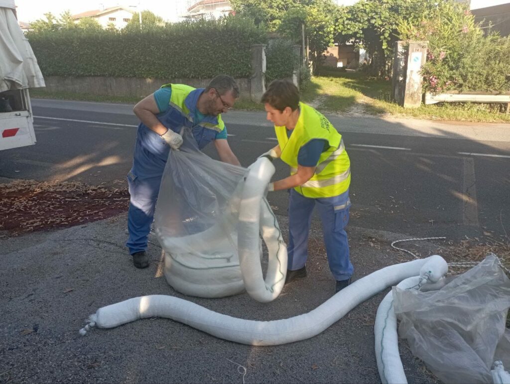 I volontari hanno posizionato dei salsicciotti assorbenti di una lunghezza di circa 5-6 metri l'uno, a una distanza di circa 2 metri l'uno dall'altro.