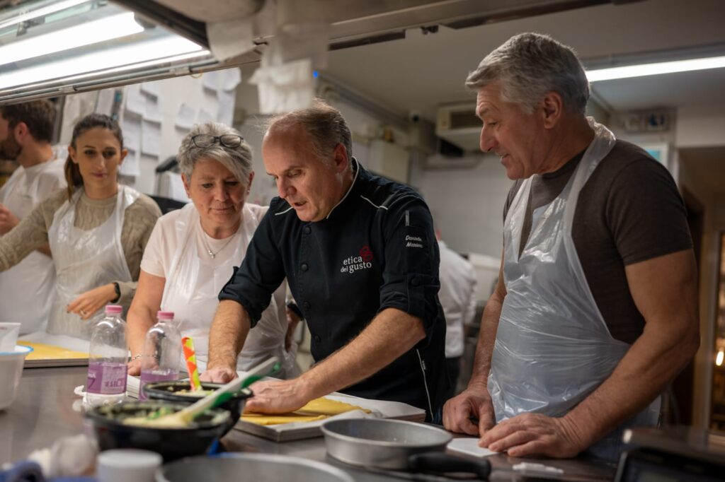 In cucina, accompagnati dallo Chef Bertossi, saranno preparati la pasta fresca per le tagliatelle con crema di montasio, porcini e pistacchio; gnocchi di zucca con fumetto di crostacei e battuta di gamberi di Mazara del Vallo; gnocchi di patate in rosso pachino con ricotta primo sale e guanciale affumicato.