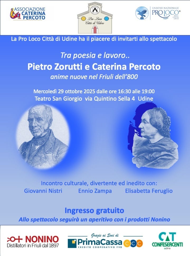 Due figure centrali della cultura friulana saranno protagoniste di una giornata di approfondimento. Dopo le due date annullate a causa del maltempo dei giorni 17 e 29 agosto, la Pro Loco Città di Udine ha riprogrammato l’incontro dedicato a riscoprire Pietro Zorutti e Caterina Percoto, anime nuove del Friuli dell’Ottocento.